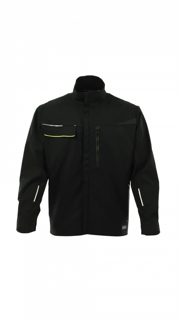 Размери: 46-64 Закопчаване отпред с цип покрит с пластрон, джоб на гърдите в дясно с капак, джоб на гърдите в ляво закопчаване с вертикален цип, два долни вътрешни джоба, регулиране на талията с копчета, регулиране на маншетите с копчета, удължен гръб, светлоотразителни елементи, еластични вложки на гърба за оптимален комфорт.