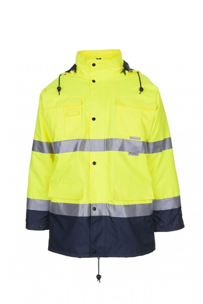 • Външна тъкан: 100% полиестер с полиуретанова промазка, подлепени водонепромокаеми шевове, със светлоотразителна лента 3M™ Scotchlite™ 8912N