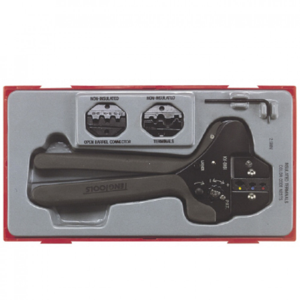 Състои се от кримпващи клещи с тресчотен механизъм и три сменяеми глави за изолирани и не изолирани клеми и ключ HEX - 2.5 mm.