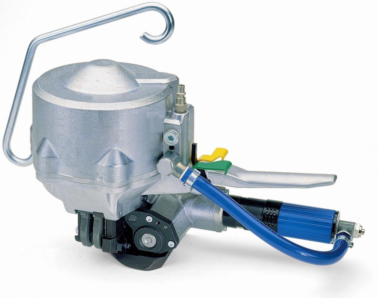 Инструментът работи с метален клипс с двойно прорязване. Перфектно изпълнение на инструмент за стационарна употреба, подходящ за опаковане на тежки товари. Максимална сила на обтягане до 8400 N. Инструментът е оборудван с пневмо-мотор от шведската фирма Atlas Copco, гаранция за много дълъг експлоатационен период.