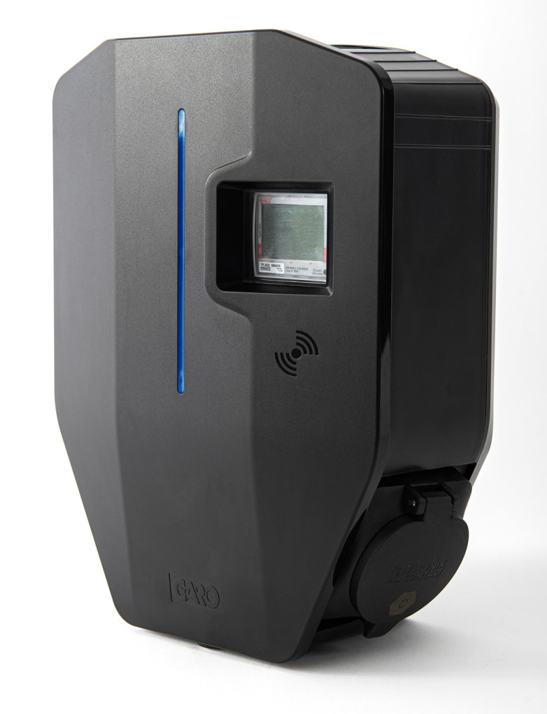 Зарядна станция Entity Pro 22 kW с контакт, фазово балансиране, видим MID електромер и модем със SIM карта за GARO Connect. Entity PRO представлява цялостна стенна зарядна станция, състояща се от следните компоненти: монтажна конзола, заряден модул и преден панел. Моделът е оборудван с контакт.
