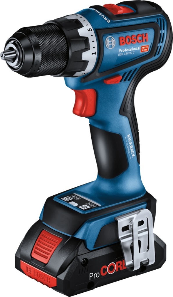 Превключващ се Kickback Control и превключващ се прецизен съединител осигуряват перфектен контрол и повишена защита на потребителя и инструмента. Този инструмент е предназначен за пробиване в дърво с максимален диаметър 68 mm и в стомана с диаметър до 13 mm. GSR 18V-90 C Professional е съвместим с всички 18 V акумулаторни батерии и зарядни устройства Bosch Professional (професионална 18 V система). Също е съвместима с AMPShare.