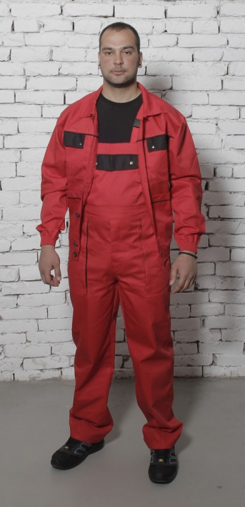 Полугащеризон: закопчаване отпред и отстрани с копчета, два долни странични джоба, джоб на гърдите с цип, покрит с капак и закопчаване с тик-так копчета, един заден и един инструментален джоб на десния крачол.