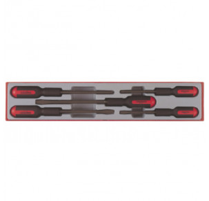 Фосфатиран черен връх. Ергономичен дизайн на двукомпонентна дръжка с отвор за закачване. DIN 5264. С кръгла работна част /0.4-1.6 мм / и шестстена работна част / 1.0-1.6 мм /. Слот – Прав.