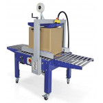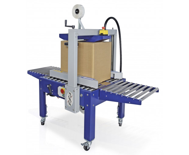Машина за затваряне с тиксо на кашони с различни размери. Машината е с горно и долно придвижване на кашона. Затварянето на кашоните отгоре и отдолу става едновременно.