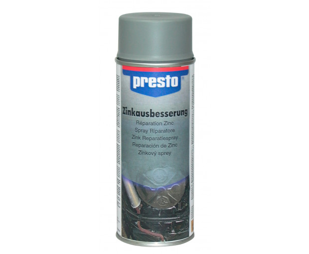 PRESTO спрей за поправки на поцинковани повърхности е бързосъхнещ с отлична адхезия, подходящ за поправки на не много големи повреди и съвпадащ цветово с повърхности от стомана галванизирана чрез потапяне, например водосточни тръби, улуци, контейнери и др. Устойчив на драскотини и на износване. Устойчив на петрол, слаби киселини и основи, атмосферни влияния. Не избелява на светлина и е UV- устойчив. Устойчиви на надраскване и удари.