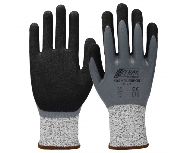NITRAS OIL GRIP CUT, ръкавици за защита от порязвания, специална сива прежда, двуслойно покритие, долно покритие: нитрил, сиво, изцяло покрито, горно покритие: шлифован нитрил, черно (цветов код: 1210), частично покритие на дланта и върховете на пръстите, плетени китка, висока устойчивост на срязване, водоотблъскваща, перфектен маслен захват, най-добра сръчност
