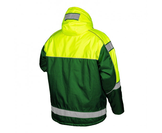 отзад отново до вратната извивка. Пристягане в долната част на якето с еластична връзка. Якето е с удължен гръб за по-голяма защита от студ. В края на вътрешните ръкави има допълнителни плетени маншети, за да задържат топлината. Ширината на маншетите се регулира с велкро лента. Две светлоотразителни прекъснати ленти с ширина 50мм в зоната на рамото и две в зоната на лакътя. Една прекъсната светлоотразителна лента, с ширина 50мм, на качулката. Една светлоотразителна прекъсната лента, с ширина 50 мм, в долната задна част на якето. Светлоотразителен паспел на гърба. Капитонирана със светлоотразителен конец подплата. Отвор, затварящ се с цип и с капак във вътрешната долна част на якето. Шевовете са подлепени.