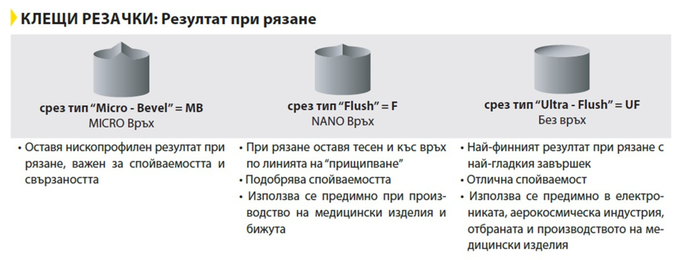Flush (NANO Връх): При рязане оставя тесен и къс връх по линията на “прищипване”; Подобрява спойваемостта • Използва се предимно при производство на медицински изделия и бижута