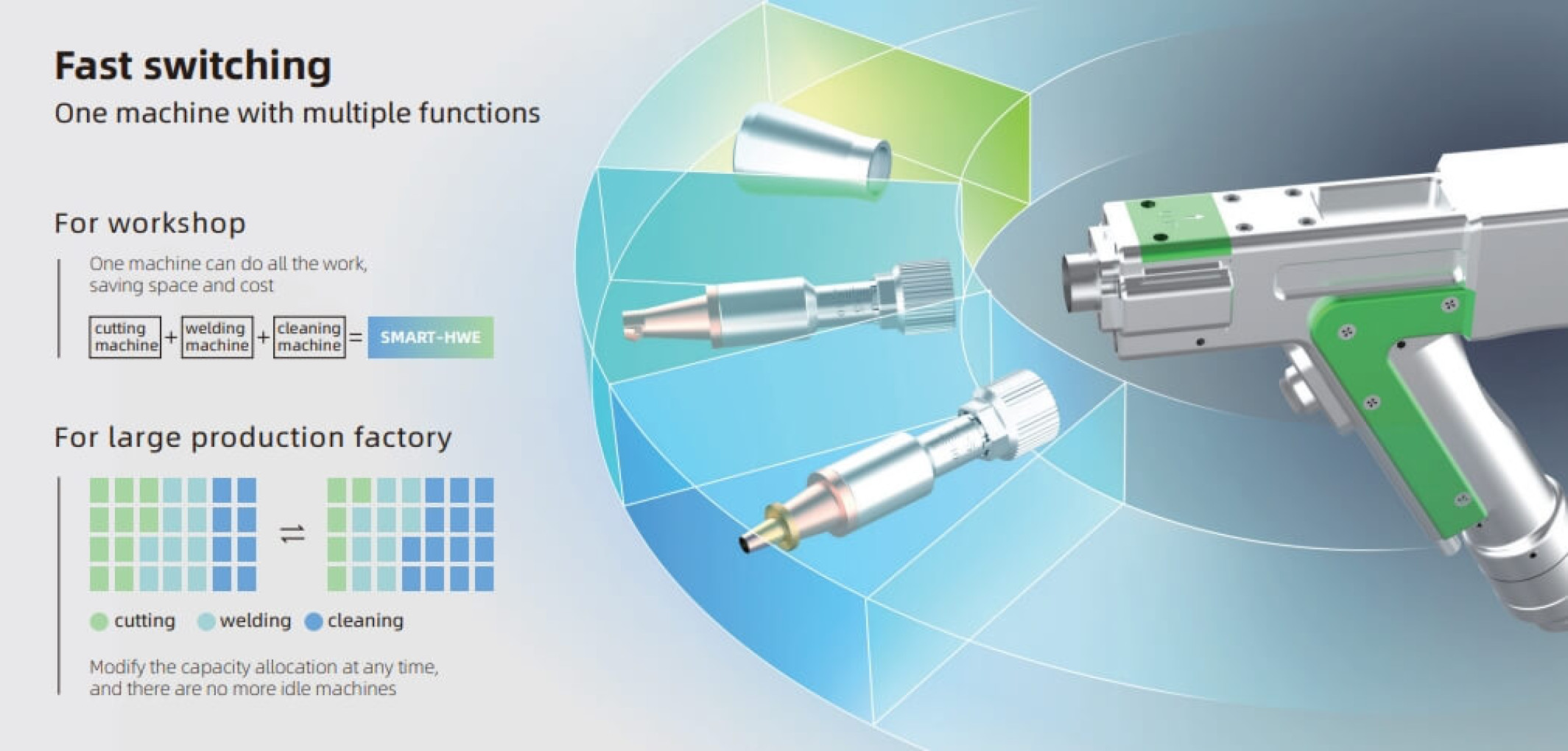 Многофункционалната ръчна машина за лазерно заваряване с файбър лазер , рязане и почистване е много ефективна и отговаря на разнообразни нужди, включително, заваряване и почистване на повърхности, както и рязане на метал. Тя предлага различни възможности за заваряване. Корпусът на заваръчната машина е ергономично проектиран, лек и компактен, за да осигури оптимална производителност.