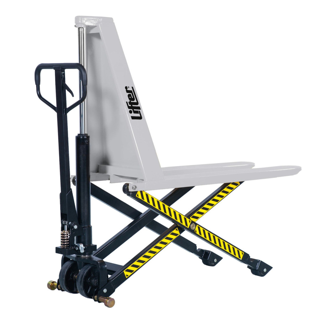 Ръчна палетна количка за високо повдигане на товара до H=800мм, с ръчно издигане , товароносимост 1000 кг и вилици L=1150 мм.